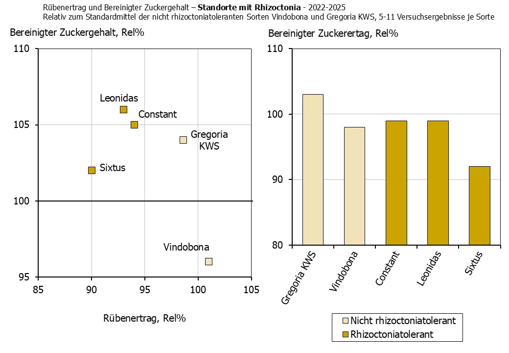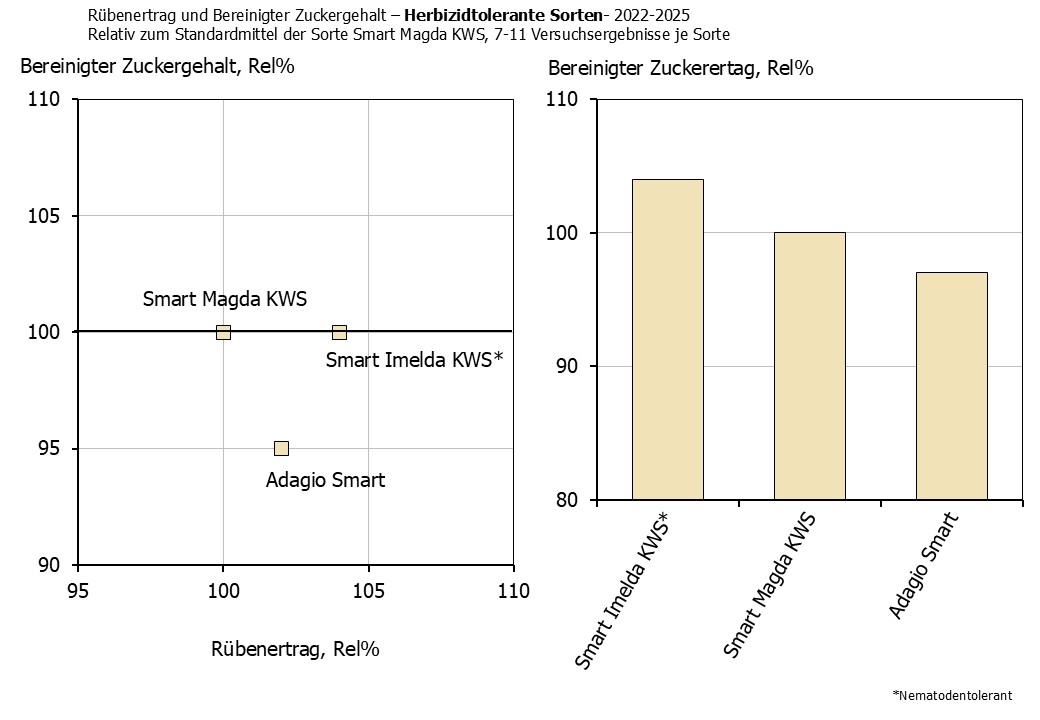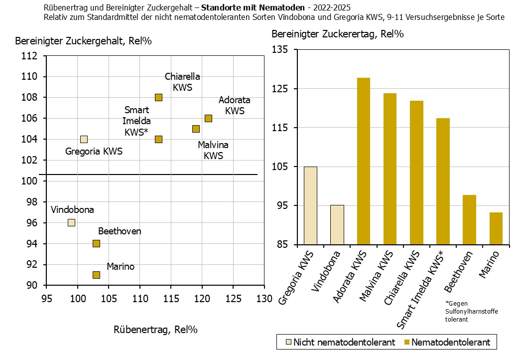 Bei Nematoden- und rhizoctoniatoleranten Sorten wurde die Merkmalsausprägung auch unter Befallsbedingungen dargestellt. Bei herbizidtoleranten Sorten unter der Verwendung von Sulfonylharnstoffen zur Beikrautregulierung.